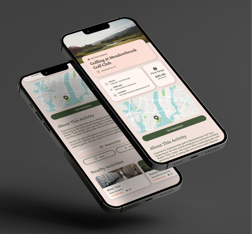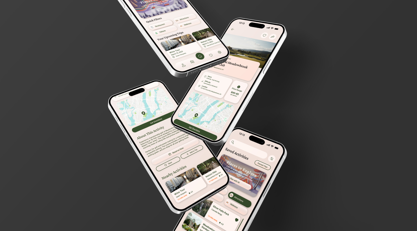 This app offers an intuitive and modern UX/UI, designed to make local trip planning simple and engaging. Key features include customizable itineraries, AI-powered activity suggestions, and the ability to save and organize users' favorite spots. They can also filter activities by type, such as restaurants, nature, attractions, or wellness, to easily find experiences that match their interests. I designed custom icons and used AI (Visual Electric AI) to generate unique illustrations, giving the app a cohesive and visually appealing look that enhances the overall user experience.